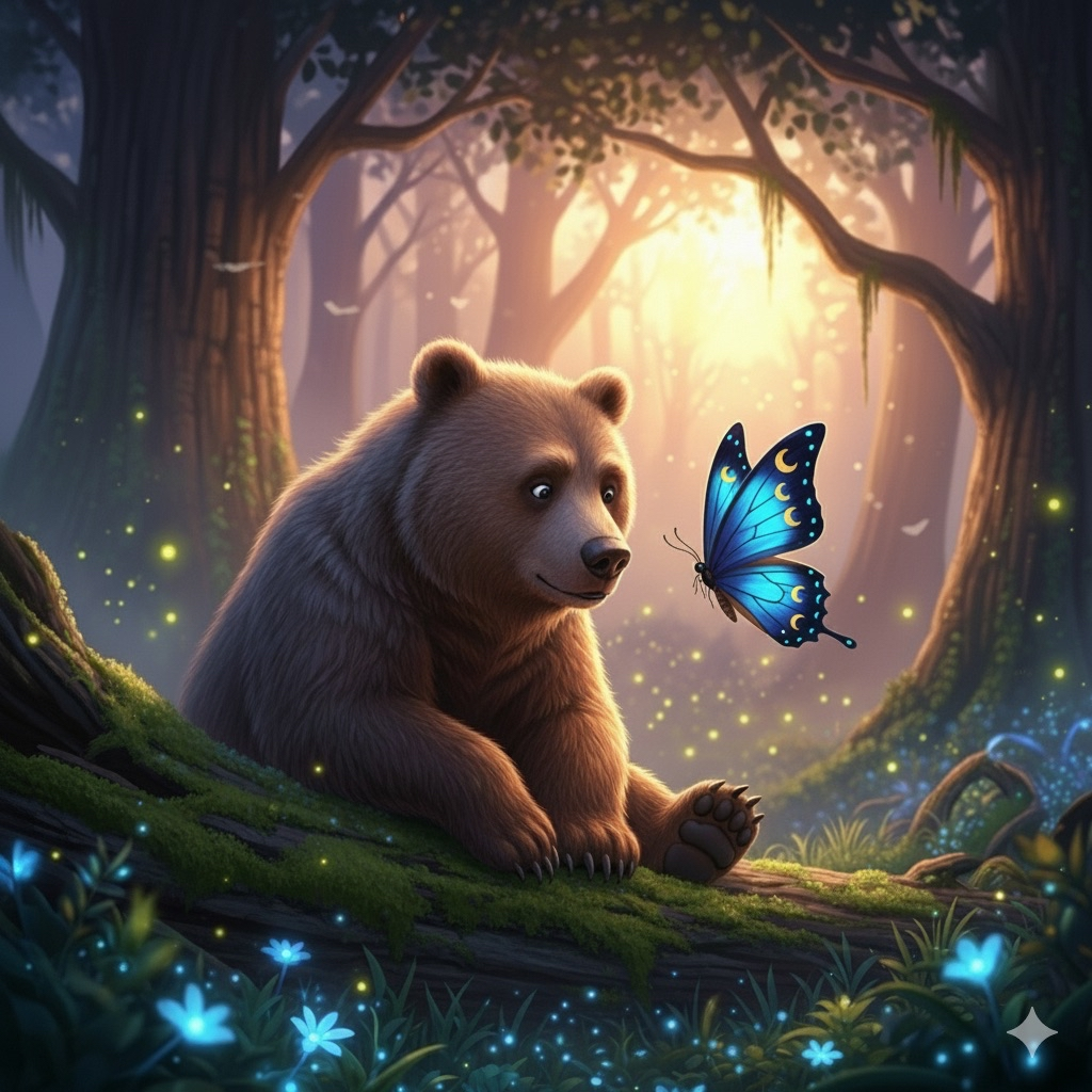 A bear walks softly through twilight’s glow, Where duskwing butterflies flit and flow. He pauses, watching wings take flight, Gentle wonders in fading light— Strength and beauty share the night.